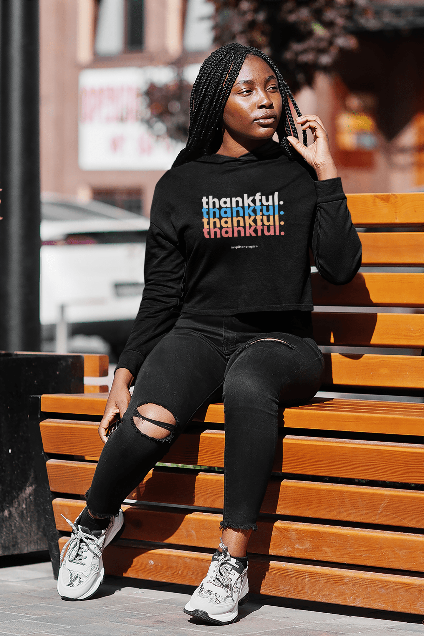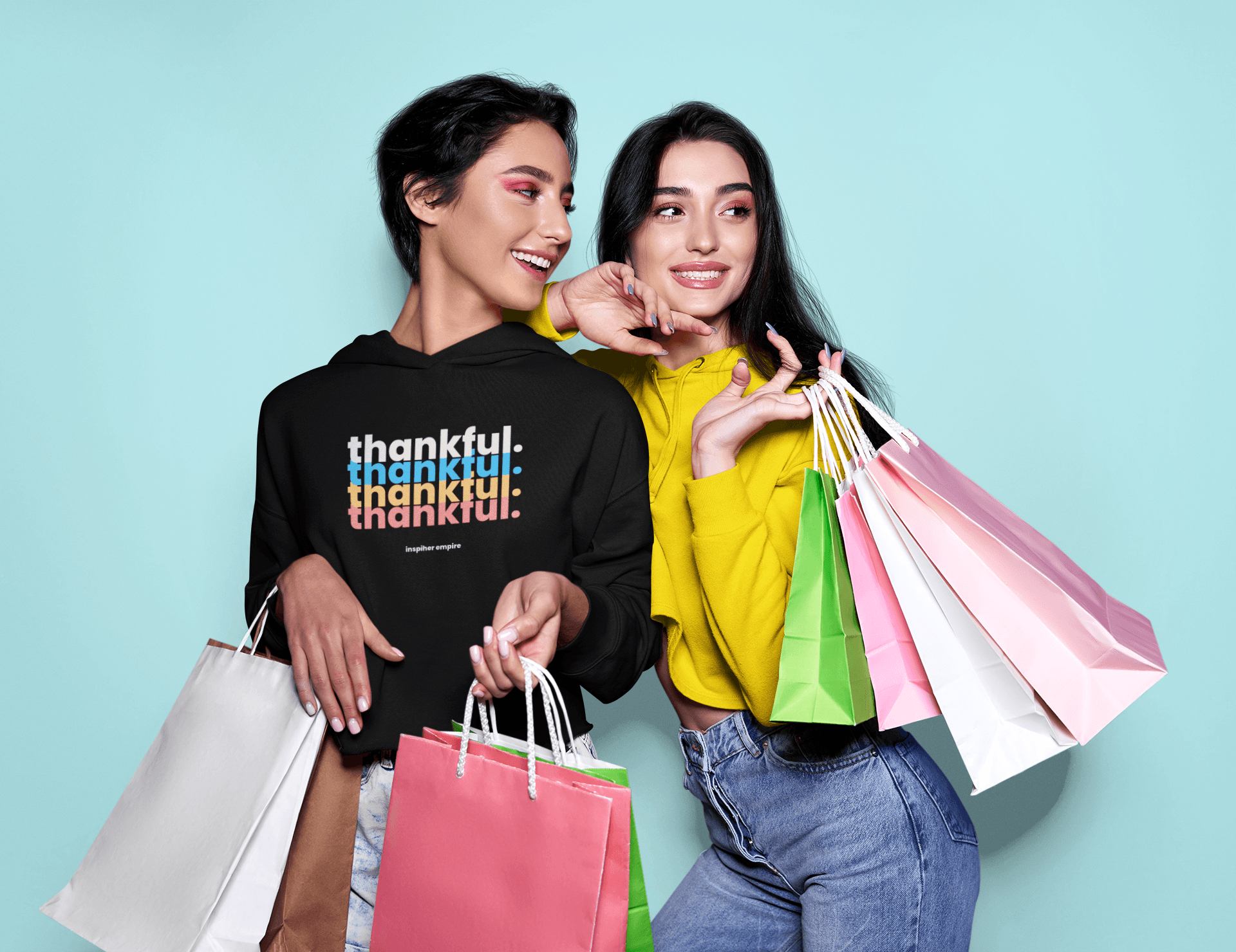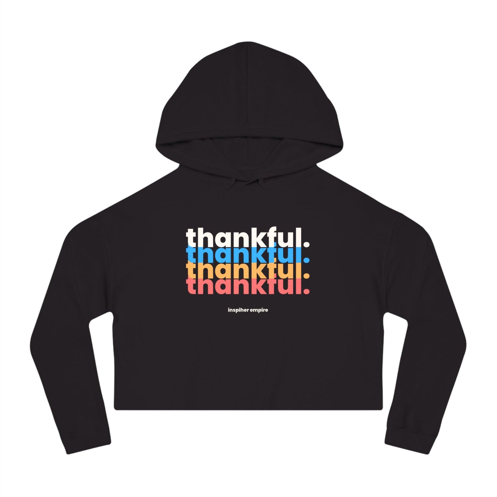 From its cropped style and fun colorful design, our 'Thankful' Crop Top Hoodie has chic written all over it. We are all about comfort & cuteness. Now, that's something to be thankful for!